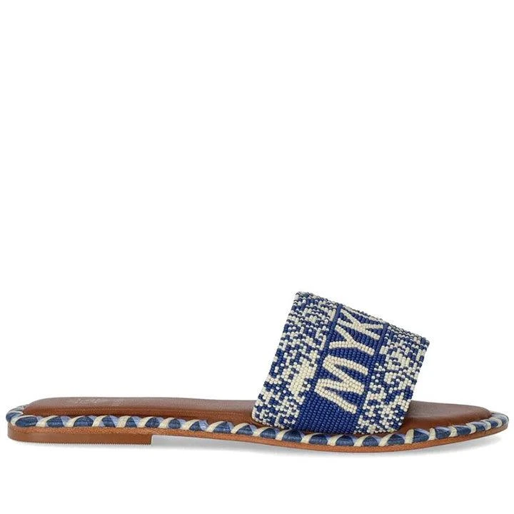 De Siena Mykonos slide made of light brown leather, embellished with beads in shades of blue on the front and tricolor raffia finishes on the insole. Leather sole, heel height 1 cm