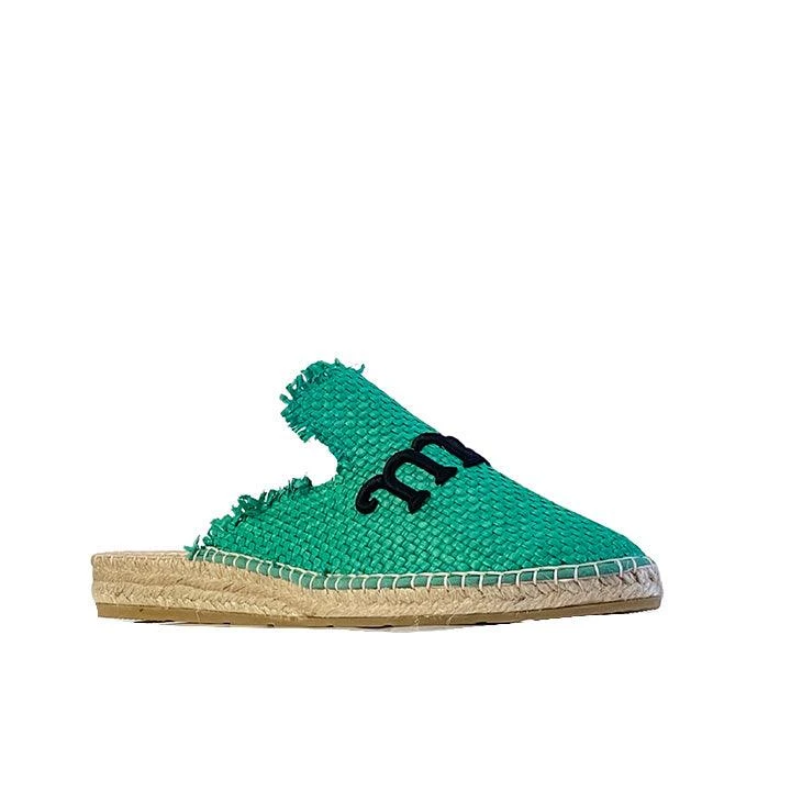 Flat slingback espadrille slipper style made with green color raffia material.