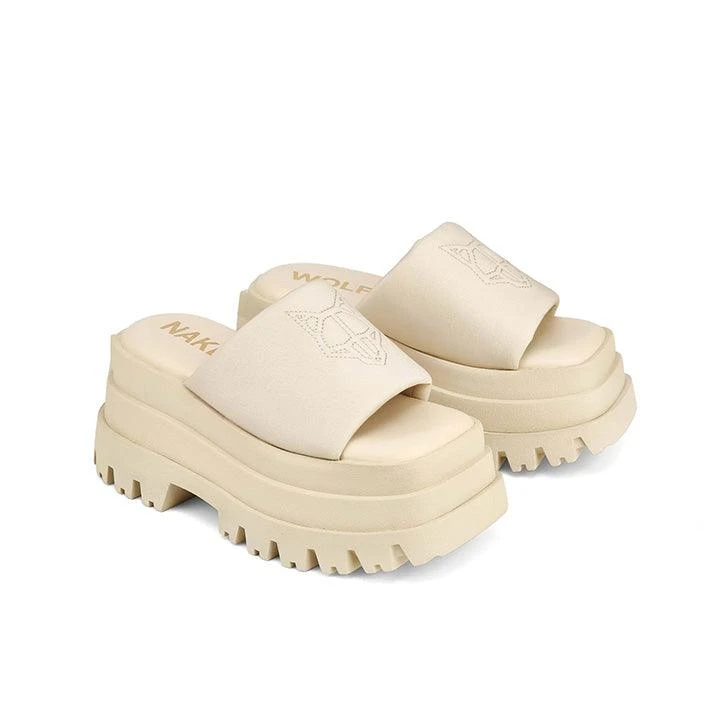 Delicious our new chunky sandal. Delicious is made up of a soft padded nylon upper with an embroided wolfe head logo. Delicious is on a brand new Naked Wolfe construction. Featuring a three-tier platform with a bold square toe.